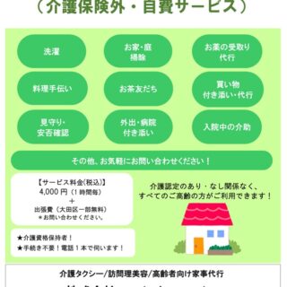 お知らせ 高齢者向け家事代行サービス(介護保険外・自費)のご案内 大田区の高齢者向け家事代行サービス(介護保険外・自費)です。大田区全域対応!出張パソコンレッスンも可能ですので、お気軽にお問い合わせください。 2025.12.22 お知らせ